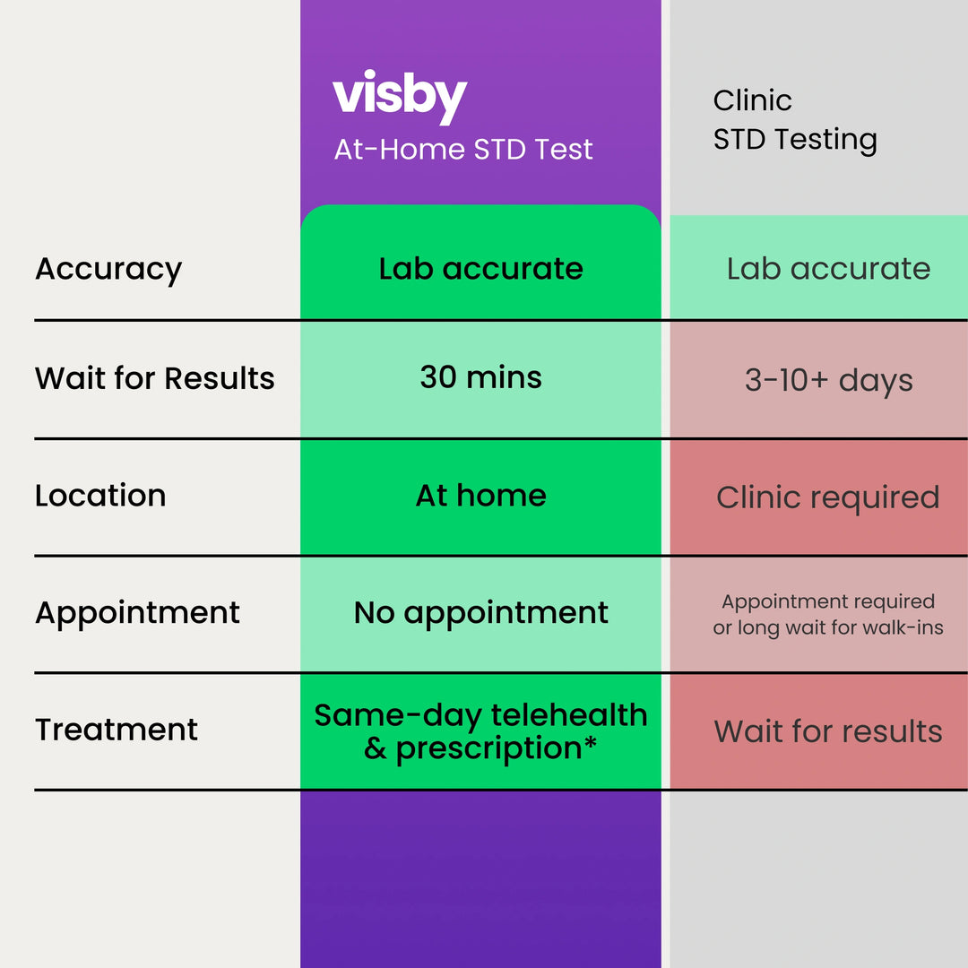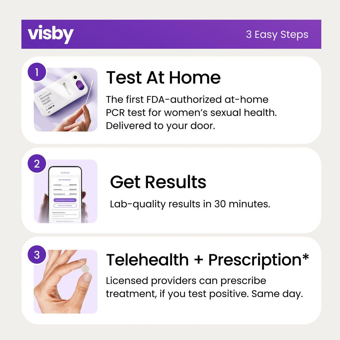 The Visby Rapid PCR At-Home Female STD Test comes with an included telehealth visit if you experience a positive result. You will have the option within the Visby Medical App to connect with a licensed telehealth provider to discuss your test result and treatment options (a prescription could entail an additional cost depending on your insurance coverage).