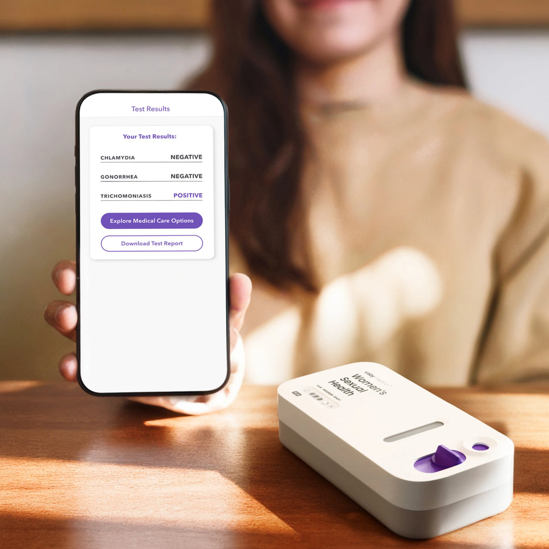 The first FDA-authorized at-home PCR test for women’s sexual health. With one gentle swab—no mailing required—you can detect the three most common curable STIs - chlamydia, gonorrhea, and trichomoniasis - and view secure, private results on your phone in about 30 minutes. If you test positive, same-day telehealth care included*.